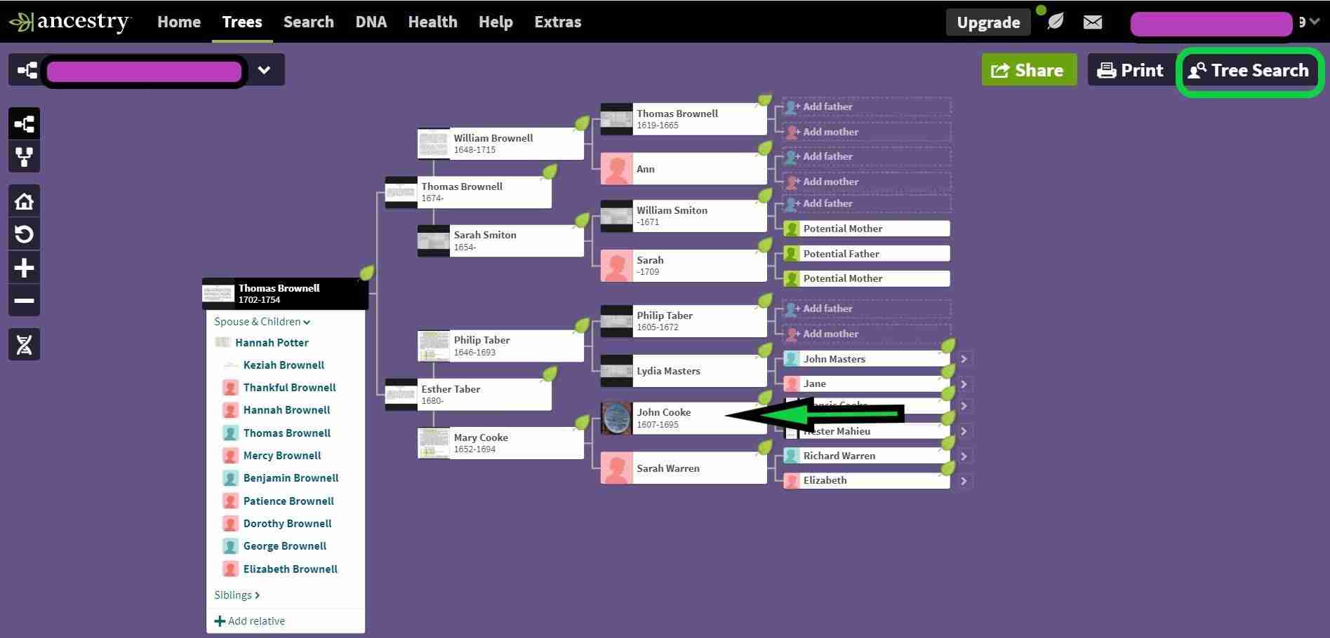 - If you don’t see the person in the “Tree views” then click “Tree Search” on the upper right side of the screen under your profile photo and name. Start typing the person’s name and the search will start generating people from your tree.